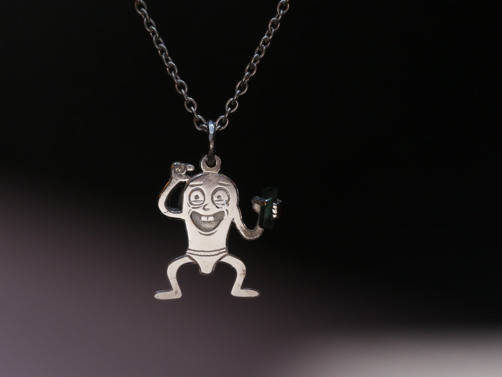 The tourmaline was cut specifically for this pendant and set into the raised hand, becoming part of the character rather than a simple decoration. The contrast between the clean silver and the deep colour of the stone adds a quiet focus to the composition.